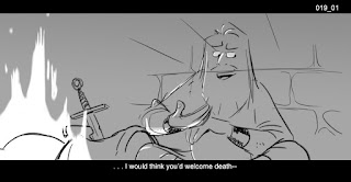 These storyboards are for the scene that happens directly after this. The knight sits down to count his coin, happy that things are going his way. But the dragon has some thoughts on the ethics of their little scam.